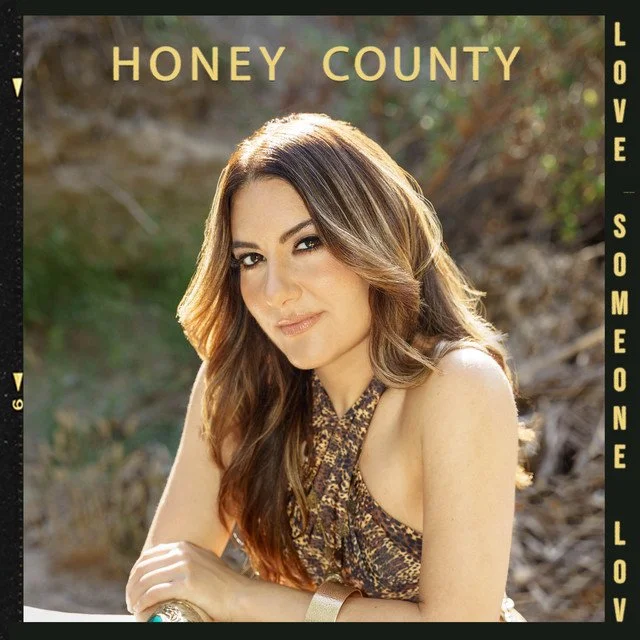 A woman with long, wavy hair and a patterned sleeveless top outdoors, with text that reads "Honey County" at the top and "Love Someone Love" on the right side.