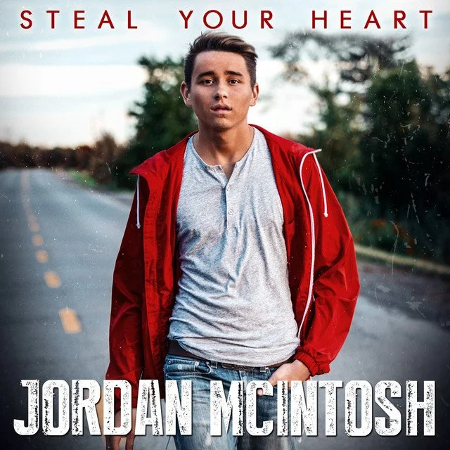Young man standing alone on an empty road, wearing a red jacket and a grey T-shirt, with trees blurred in the background, and the text 'Steal Your Heart' at the top and 'Jordan McIntosh' at the bottom.