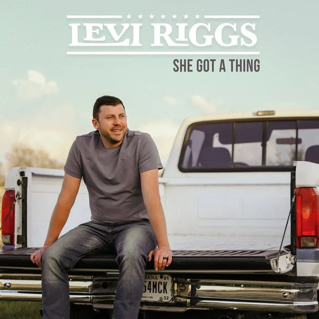 Levi Riggs sitting on the tailgate of a white pickup truck, smiling, with an album cover layout featuring his name and the words 'She Got a Thing' in the background.