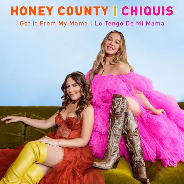 Two women sitting on a green couch, one wearing an orange dress with yellow boots, and the other wearing a pink dress with patterned brown boots, smiling. The background has text about Honey County and Chiquis, with song titles "Got It From My Mama"