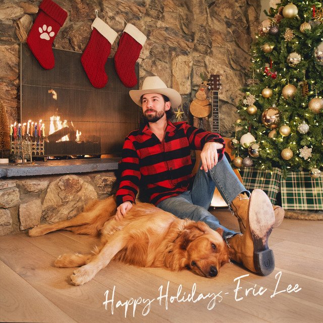 A man with a beard and mustache wearing a cowboy hat, red and black checkered shirt, jeans, and boots sitting on the floor next to a golden retriever that is lying down. Behind them, there is a stone fireplace with three red Christmas stockings hangi