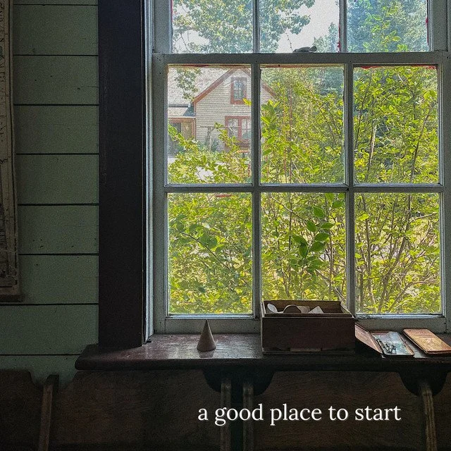 View through a window showing green trees and a neighboring house with a gabled roof, set indoors with a wooden table or window sill holding booklets or magazines, and a small cone-shaped ornament. Text overlay reads 'a good place to start.'